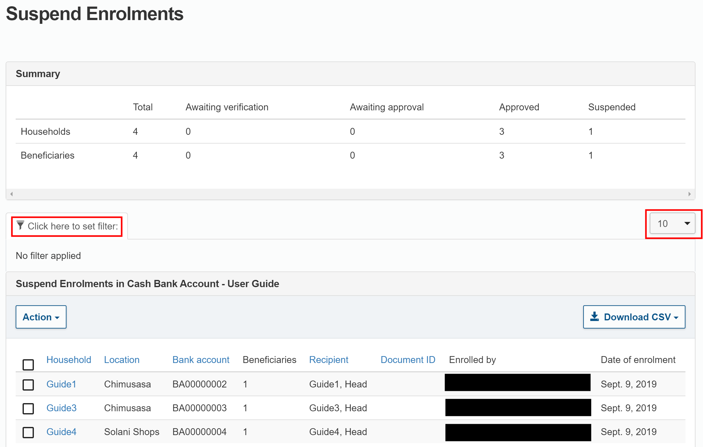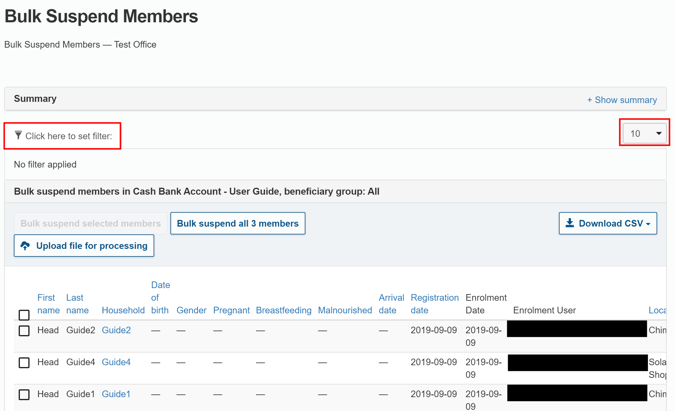 In the Suspend Enrolments page, find the households you want to suspend. By default, 10 households are displayed on each page.