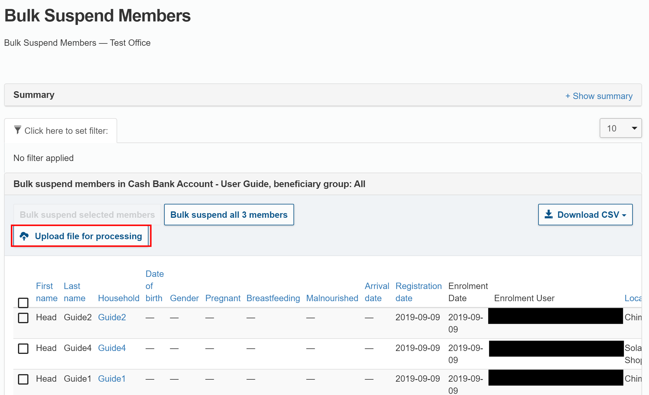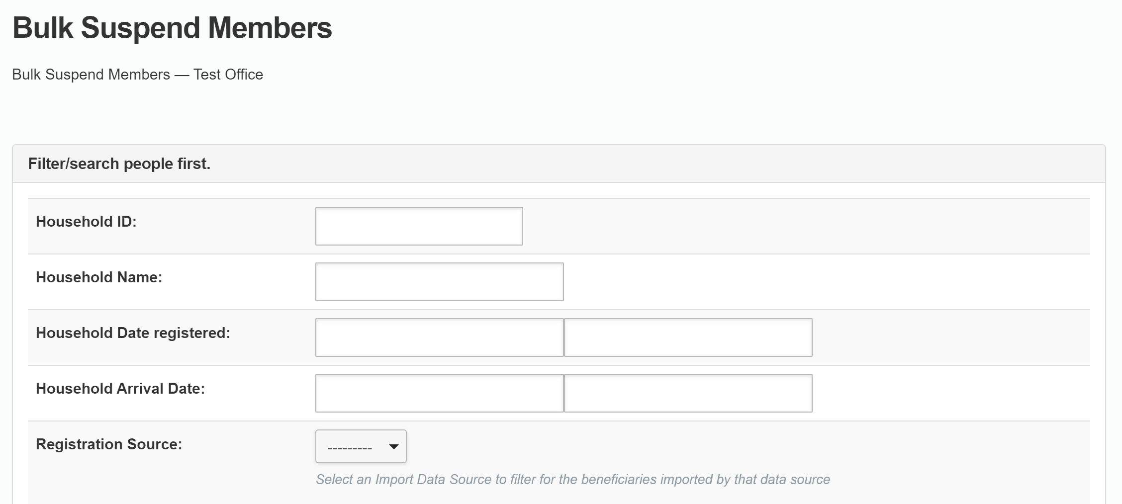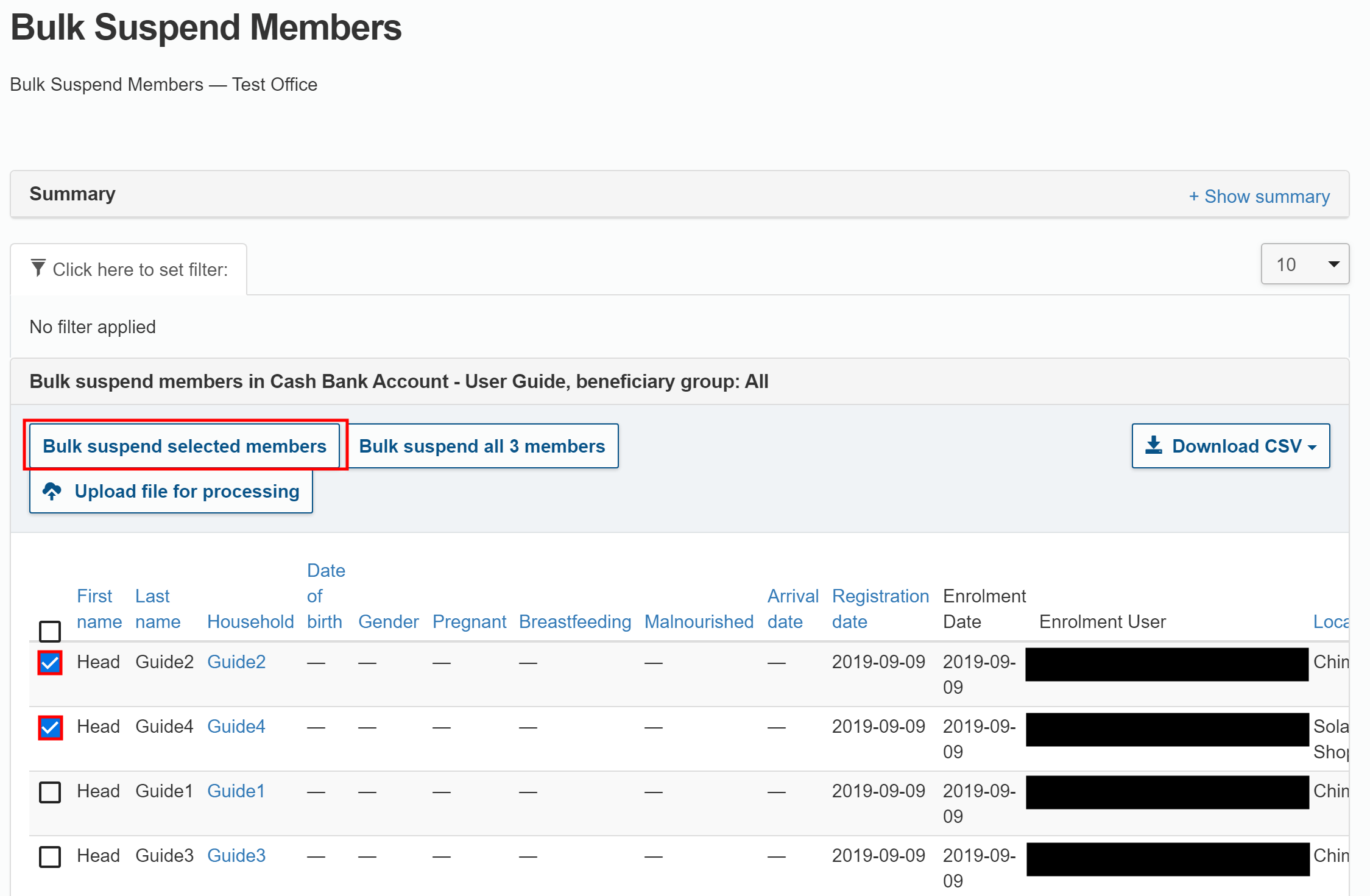 - Bulk Suspend Members allows you to suspend several beneficiaries at the same time. This method makes it easy to suspend multiple beneficiaries and allows you to filter selected groups of beneficiaries according to filter criteria. For example, you can use the age filter to suspend everyone in one location that is no longer a part of the intervention. This method allows you to also use a CSV file to suspend beneficiaries.