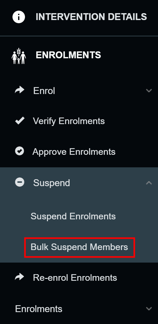 Before suspending an enrolment you must identify which beneficiaries and households you want suspended from the intervention. Carefully review your interventions to find all the enrolments that must be suspended.
