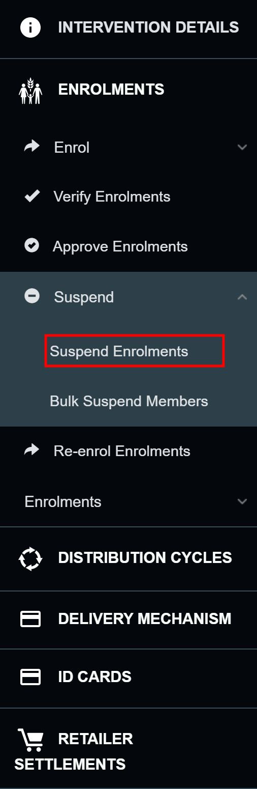 Suspending enrolments is how you remove households or beneficiaries from interventions so that they will no longer receive benefits and entitlements. Suspending enrolments involves identifying individuals or households in the intervention area who are no longer eligible for benefits and suspending them from the intervention.