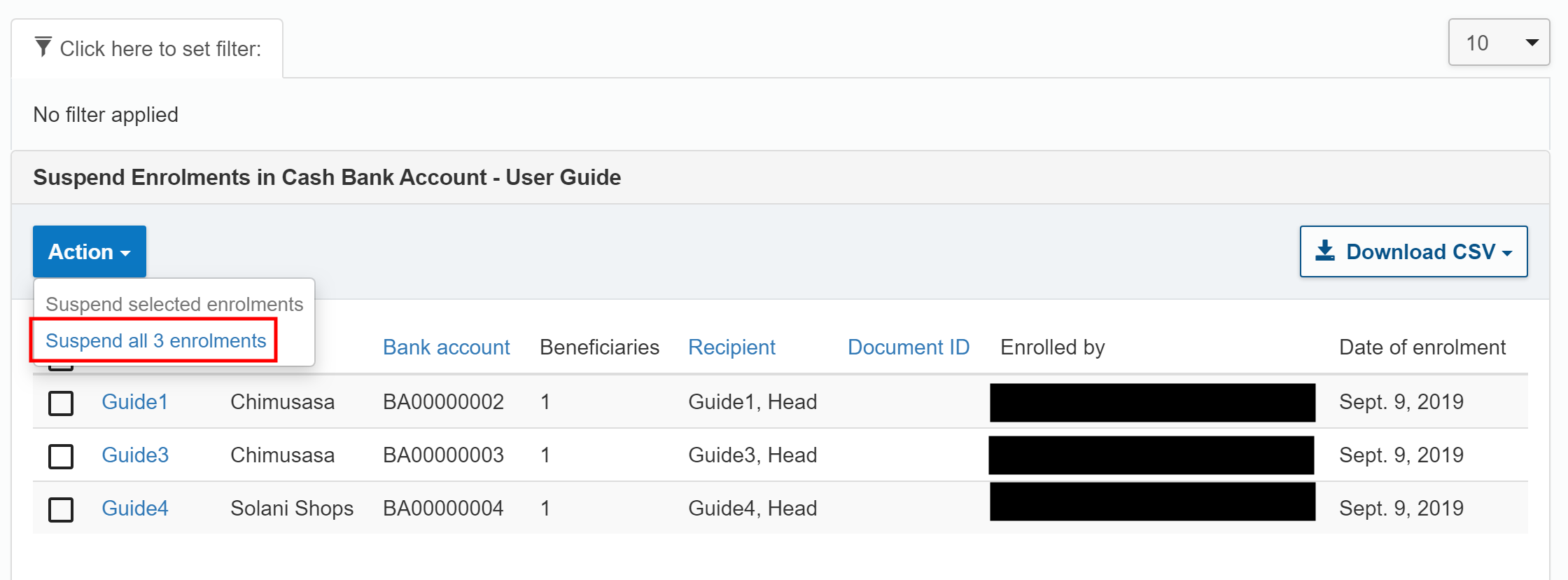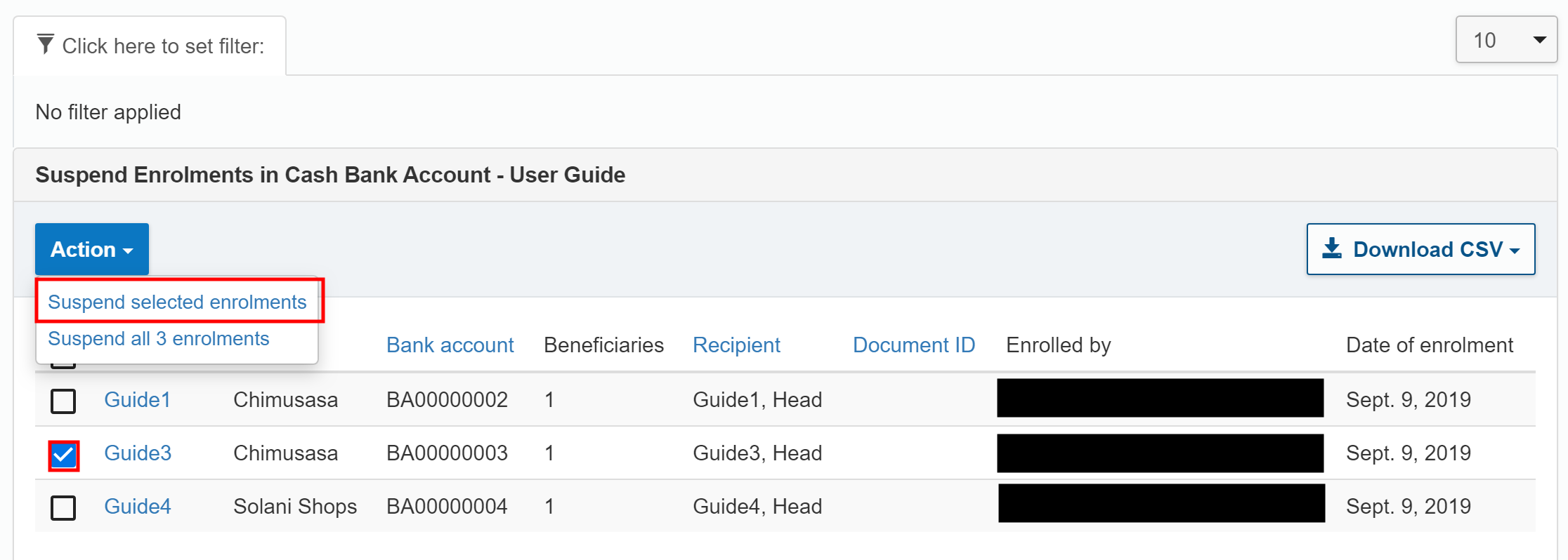In the filter results page find the beneficiaries you want to suspend. By default, 10 beneficiaries are displayed on each page. You can use the filter to further refine the results.