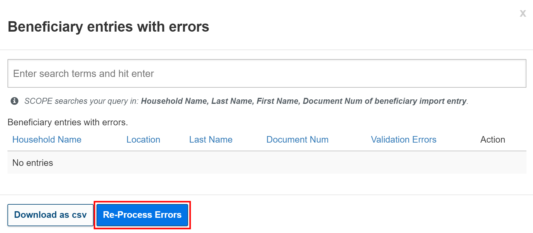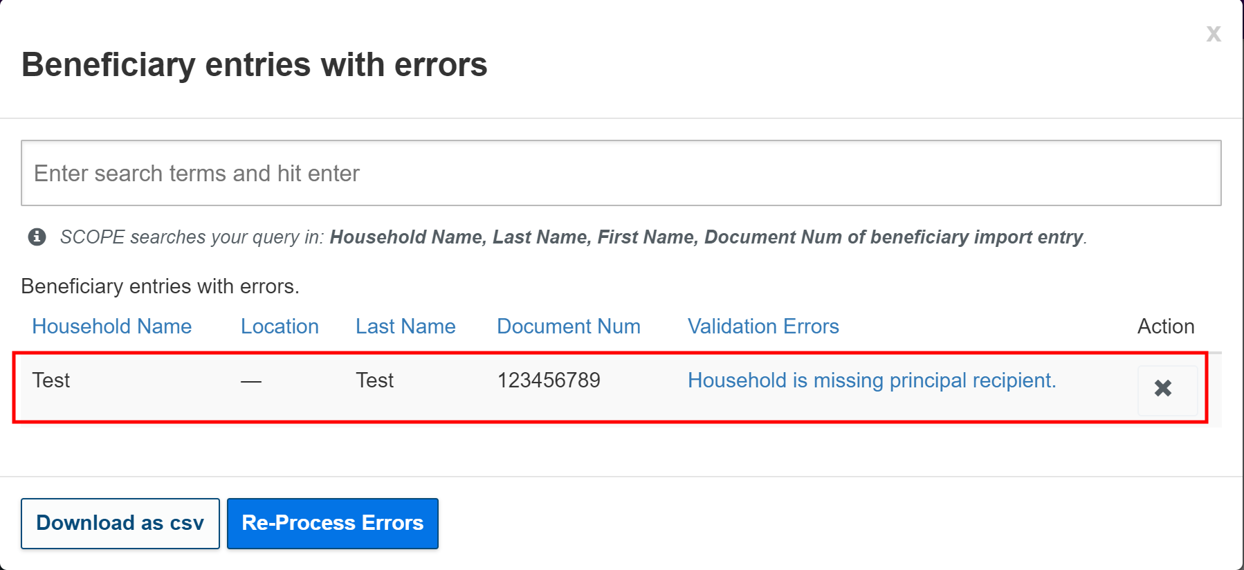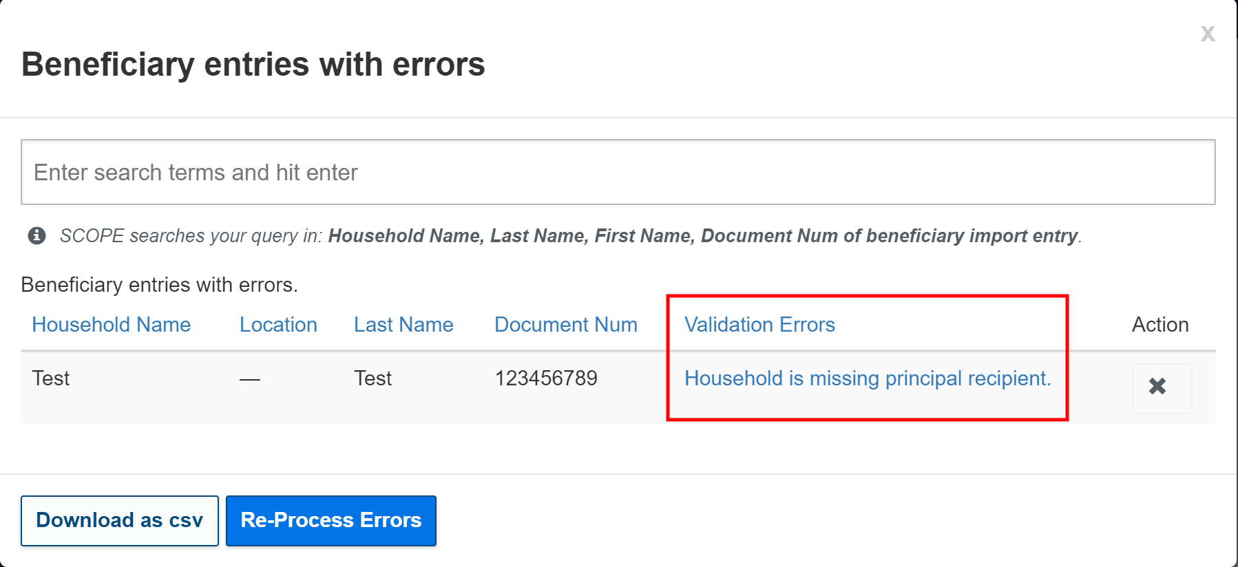 In the Beneficiaries entries with errors window, the errors for individuals and households are listed in the Validation Errors column.